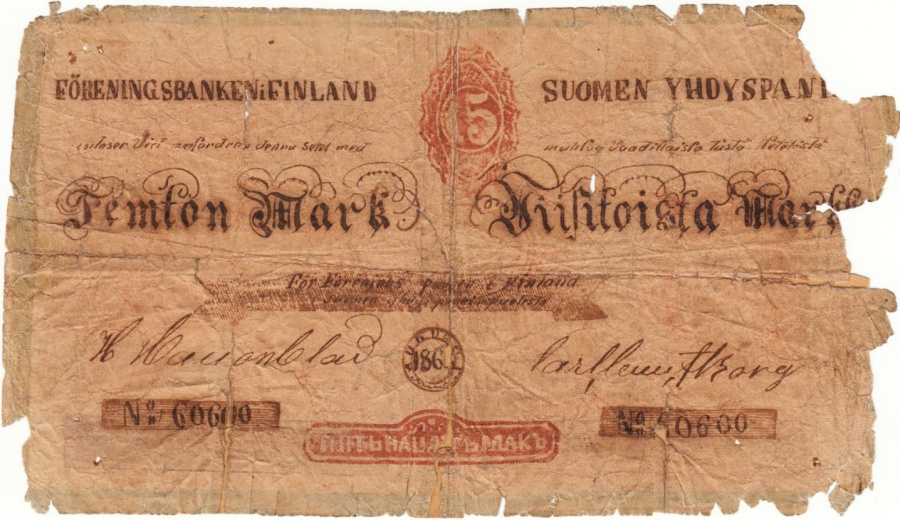 Почти сразу после утверждения собственной денежной единицы для Великого княжества Финляндского, даже несколькими годами ранее выпуска собственных монет, для организации чеканки которых требовались постройка и оснащение полноценного монетного двора, государственный банк Великого княжества приступил к выпуску бумажных денег достоинством в 1, 3, 5, 10, 12 (выпуск образца 1862 г., о нём мы ещё вспомним далее), 20, 40 (после выпуска с датировкой 1862 было принято решение о целесообразности печатания 50-марочников), 100, а также (с 1878 г.) 500 и (с 1909 г.) – 1000 марок.