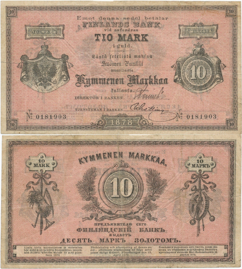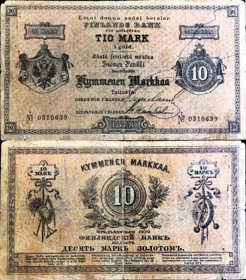 25.09.1881 Åbo Underrättelser № 260 В нашем районе появились фальшивые 10-марочные купюры. Один предприниматель нашел одну из них среди предъявленных в местное отделение Банка Финляндии. Банкнота была качественно сделана и считается одной из подделок, разработанных в России. Населению рекомендуется быть бдительными и осторожными при получении банкнот номиналом 10 марок.