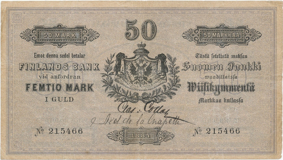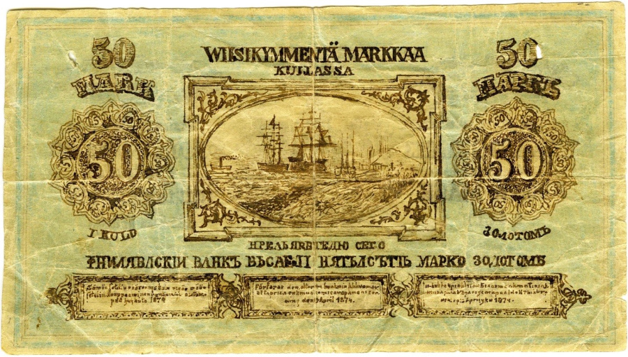 Арестованные вчера, как уже сообщалось, за распространение фальшивых 50-марочных банкнот, не все оказались из Юлистаро, а лишь несколько из них, а именно Мария Йерн и фермер Юха Исайасенпойка из Хакомяки, кроме них - третий, Каарле Юхонпойка Витала, он же Вийникайнен, родом из Кирконкюля. Последний, судя по всему, и является изготовителем банкнот, поскольку в прошлом он уже был наказан за подделку документов. Хакомяки сдал одну банкноту лавке шорника Видгрина, а Марии Йерн удалось реализовать две. <….> Как уже говорилось, банкноты – скверного качества. Они выглядят так, словно нарисованы от руки, и отличить их можно даже по бумаге. В шведском тексте сильный финский «акцент», а русский текст повсюду представлен ещё более ужасно. Кроме того, авторами было признано ненужным даже снабжать одну из банкнот необходимыми подписями.