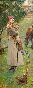 В предпоследнем ряду работа Павла Рыженко "Царские погоны". Открыл с год назад для себя этого художника, побывав довольно случайно на его выставке. Прожил всего 43 года, умер в 2014. Экскурсии проводила вдова художника. Описывать впечатления бессмысленно, что-то совершенно потрясающее по эмоциональному воздействию.
