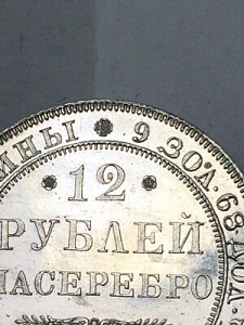 Уважаемый Knight! Конечно я дам Вам и всем расширенный ответ! Как Вы, наверное, уже поняли, я интересуюсь специфическими предметами нумизматики. Такими, которые не слишком востребованные на рынке, а просто несут некую эстетику. И, на что я обратил внимние за долгие годы наблюдений, что старинные унцовки, в первую очередь отличаются от новодельных и фальшивых - микротрещинками с отслоением металла на поле, бывает и на рельефе. Я не могу объснить феномен этого явления и, чесно говоря, никогда не интересовался им, но это действительно имеет место. Даже если монета в состоянии пруф-лайк под микроскопом или даже лупой-десяткой Вы увидите одну или несколько этих трещинок. Со старинных же крупных монет после обращение эти отслоения верхнего слоя, бывает просто отдираются. На мой взгляд это первый признак подлинности, независимо от того монета из губчатой платины или литого золота, о чем я и указал в посте №29. Дальше, конкретно по двенашке из поста № 27. От буквы "з", через "12" и "Р" до основания "п" видна "протяжка" в виде поцарапанной слоености,а также от "Н" до "й", а также от "о" до "О" видна "протяжка" в виде выпуклости, что однозначно указывает на губчатую платину или конкретней, как бы сказать на внутреннюю пульсацию металла от сужения к утолщению в определенных местах, которая перешла на монету из прокатанного листа, в свою очередь прокатанного из платинового прутика. Думаю, это явление можно по-научному объяснить, но это займет много времени.Итого, в остатке, мы имеем монету, с неравномерной толщиной заготовки и и эти так сказать "горы" и "долины" движутся "горным хребтом" по диагонали через весь слой монетного кружка вниз от 2 к 8 часам. Что более или менее знакомым с технологией изготовления металла для оригинальных платиновых монет однозначно указывает на подлинность. Сторона орла. Ну тут я уж извините разойдусь, но вставлю свои "три копейки" по поводу отсутствия "меток" для рестрайков или фальшаков)))) Ну, извините! Хотя одну подозрительную точку таки нашел!!! В финском гербе на шее льва))). Но это, скорее всего игра света, так как голова и грудинка льва потерта, а точка нет. В любом случае, даже если она там даже присутствует, а тогда надо сравнивать с другими монетами, она могла образоваться из-за выкрошки штемпеля в этом месте, а самое главное, исходя из других беспорных признаков подлинности, значения не имеет. Далее. Прекрасный, а главное, глубокий прочекан всех деталей, что особенно заметно на горизонтальных и вертикальных линиях шапочки Большой Императорской Короны, а также на вертикальных линиях щита Герба Св. Георгия, ну и иконок малых гербов, на которых они присутствуют. Такого прочекана не бывает ни на новоделах, ни на фальшаках. Например если даже в одном моменте сравнить этот экземпляр с новоделом Гуттен-Чапского, то мы увидим, что горизонтальные линии на шапочке Короны на новоделе прочеканены только с верхней половины, а вертикальные внутренние у основания Короны доходят только до половины. Непрочеканенны также линии на гербе, на новоделе Гуттен-Чапского они в некоторых местах просто не доходят до конца своего движения. И это, заметьте притом, что новодел 1839 года эксклюзивный образец из губчатой платины. Кроме вышеперечисленных объективных признаков, на монете с 27 поста присутствует ряд косвенных, таких например, как разного рода характерн