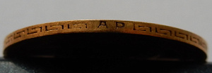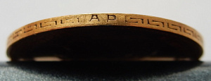 Я вижу неродное поле под АР и вокруг АР и набивку букв АР. Именно пуансоны, а не нарезка. Вероятнее всего первично был непрочекан букв (что видно по слабее выраженным узорам гурта ближе к инициалам АР), это и позволило их почти незаметно "убрать": это место не заглаживали, и забили, на последней серии фото мне это видно отчётливо. Или вариант: когда забивали первые инициалы ушли чуть вправо-влево, ведь нельзя же резко оборвать забивку, так и получилось, что узор гурта ближе к инициалам АР слабее выражен по сравнению со всем гуртом. О забивке гурта говорит и "облой" (только в этом месте!) на фото обеих сторон в районе инициалов. При таком состоянии сторон облоя уже быть не должно.
