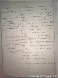 Речь идет о (переходящей, временной монете) «Империал*10 рублей золотом» первоначально задуманная Витте еще в начале 1895 года, пробные монеты которой, были отчеканены еще с портретом Николая 2 «СС-Р» (окантованная борода), которым чеканились Русы, еще до утверждения общего вида монеты 26 мая 1895 года. Сергей Юльевич, любил эту монету, это было его детище, поэтому он отчеканил «2,5 Империала*25 рублей золотом» 1896 года уже с новым портретом после 26 мая 1895 года, означающее начало Великих реформ. Конечно, в то время завершение реформы и судьба этой монеты была еще «вилами на воде писана». Такая монета должна была насытить рынок золотой монетой, но была отменена (по сведениям П.П. Мигулина, «Русский государственный кредит» 1901, были еще особые причины) в начале 1896 года (о чем и свидетельствует этот документ), и вместо нее должна была чеканиться монета (копия монеты 10 рублей (5 рублей) Александра III) с портретом Николая 2, пробные монеты 1896 года существуют. А насыщался рынок золотой монетой Александра III по Монетному уставу 1885 года. Еще 15 марта 1895 г. был составлен наряд на Монетном Дворе «О выделке 50 миллионов золотой империальной монеты» по документу от 3 марта 1895 года «Об усилении разменного фонда, обеспечивающие выпущенные в обращение государственные кредитные билеты.». И с 10 апреля по 11 августа 1895 года было изготовлено империалов, с портретом императора Александра III и датой 1894 на 50 000 000 рублей.