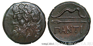Пантикапей. Перисад I, 345-310 гг до н. э. Номинал: Обол Описание аверса:Голова бородатого Сатира в венке Описание реверса:Лук, стрела, снизу надпись ПАNTI Номер по каталогу: Анохина В.А. (1986 г.)110