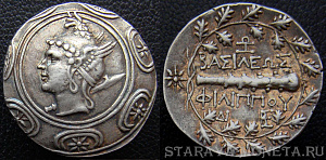 Македонское царство, Филипп II, 359-336 годы до Р.Х., статер AV статер, вес 8.48 гр., диаметр 17 мм. Время чеканки: 340/336-328 год до Р.Х. Место чеканки: Пелла. Аверс: голова Аполлона в лавровом венке, повёрнутая вправо. Реверс: ΦΙΛΙΠΠΟΥ, царь, управляющий бигой, скачущей вправо, внизу канфар.
