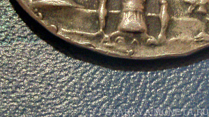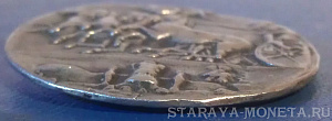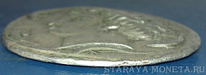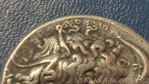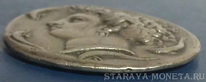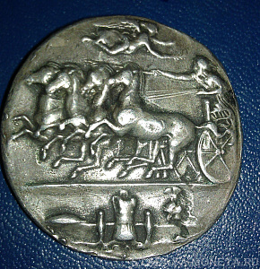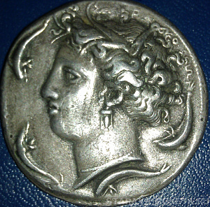 Кстати, Ваша версия содержания надписи совсем даже не беспочвенна. Покопавшись в памяти, припоминаю, что на аверсе монеты (изображение колесницы с квадригой считается аверсом) под доспехами должно быть слово . Оно не всегда полностью попадает в поле монеты, а иногда не попадает вовсе. Слово это обозначает "трофеи" или "награды" и подтверждает версию чекана монеты в честь побед Сиракуз над Карфагеном. На реверсе в волосах нимфы Аретузы находится надпись , что означает "Сиракуз".