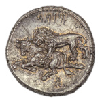 На этом денарии изображен один из двух монетных типов ранней чеканки денариев Римской Республики, аверс изображает покровительницу Города богиню Рому, а реверс – Диоскуров, военных защитников Рима. Сакральная связь Диоскуров братьев Кастора и Поллукса с римлянами появилась еще с первых лет республики, когда по легенде божественные братья помогли римлянам выиграть битву при Регильском озере в 494 г. до н.э. В благодарность римляне построили на форуме храм Кастора и Поллукса, который служил местом пребывания преторов и одновременно был хранилищем преторской казны.