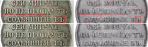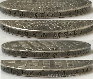 Господин LAVOCHKIN, ежели-б я данную монету живьём посмотрел, то утверждения мои были-б более твёрдые, а пока, продолжаю спорить и склоняться к подлинности с существенной вероятностью. Другое дело, кто нас мог-бы рассудить, что-б не было "переливание из пустого в порожнее", и я, "упёртый тупак", признал свою не правоту. Не категорически, но не согласен, что у данной монеты корявость шрифта, неровность букв, и прочие грехи описанные Вами говорят о не подлинности, считаю что это всё есть ничто иное, как механическое воздействие. В тоже время, я вижу, или думаю что вижу правильную стилистику написания букв реверса, декоративный точечный ободок реверса (который, как мне думается, при литьевой копии сложно подделать, сложнее чем те-самые буквы в надписи реверса) мне нравится, как и индивидуальные точки на государственной печати аверса. Ну и главный аргумент для меня гуртовая надпись, мне она, как раз, видится очень убедительной. Считаю, может по своей тугодумности, что фуфлоделу значительно легче подделать, например скопированными штемпелями, стороны монеты, и значительно сложнее гурт. Пример тому, тот самый "дворик", несколько раз проданный здесь на форуме, у той монеты, надеюсь помните, аж зеркальные поля были, но явно кривой гурт. У данной-же монеты на гурте расстояние меж букв правильное, глубина прокатки какая и должна быть, стилистика и деформация букв после чеканки. Категорически не согласен с 17-м постом, там я как раз вижу абсолютно одинаковые и правильные на гуртах обоих монет все буквы, в том числе и буквы минцмейстера, "Б" -немного деформирована при чеканке в кольце, у "Э"-верхняя завитушка была сломана ещё на гуртовой верейке.