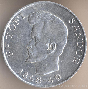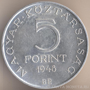 5 форинтов 1948 года, серебро 500-й пробы, масса - 12 граммов, диаметр - 32 мм, толщина - 1,9 мм, тираж - 100000 экземпляров. Гравёр: Йожеф Ремены. Будапештский МД. Единственный выпуск; посвящён Столетию Революции 1848 года и одному из её руководителей, поэту Шандору Петефи.