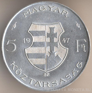 Вторая Венгерская Республика (1 февраля 1946 - 20 августа 1949 года). 5 форинтов 1947 года, серебро 500-й пробы, масса - 12 граммов, диаметр - 32 мм, толщина - 1,9 мм, тираж - 10004252 экземпляра. Единственный выпуск. На монете изображён Лайош Кошут - правитель-президент Венгрии в период Революции 1848-1849 годов.