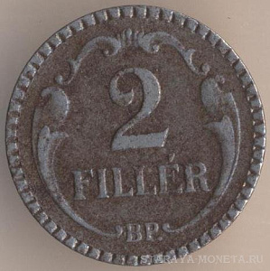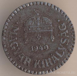2 филлера 1940 года, сталь, масса - 3,3 грамма, диаметр - 19 мм, толщина - 1,6 мм, тираж - 64500000 экземпляров. Гравёр: Янош Палинкас. Будапештский МД. Чеканились в 1940-42 годах. В обращении до 31 декабря 1945 года.