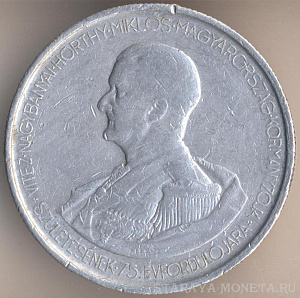 2 пенгё 1938 года, серебро 640-й пробы, масса - 10 граммов, диаметр - 27 мм, толщина - 2,1 мм, тираж - 6417000 экземпляров. Гравёры: Иштван Шентгьёрги (аверс) и Винс Питтнер (реверс - Мадонна с Младенцем). Будапештский МД. Чеканились в 1929, 1931-33 и 1935-39 годах. Выведены из обращения 31 января 1942 года.