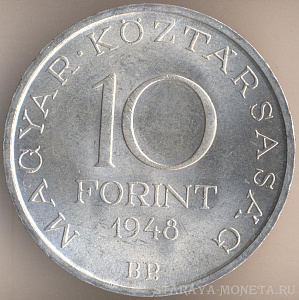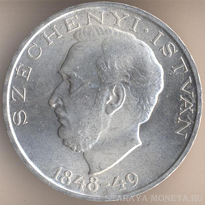 10 форинтов 1948 года, серебро 500-й пробы, масса - 20 граммов, диаметр - 36 мм, толщина - 2,5 мм, тираж - 100000 экземпляров. Гравёр: Йожеф Ремени. Будапештский монетный двор. "Столетие революции 1848 года - Иштван Сечени". Единственный выпуск. В обращении до 30 июня 1977 года.
