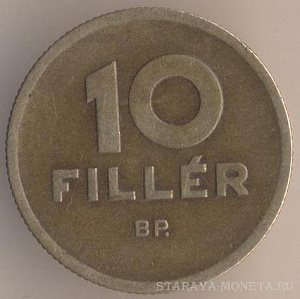 10 филлеров 1947 года, алюминиево-бронзовый сплав, масса - 3,1 грамма, диаметр - 19,1 мм, толщина - 1,5 мм, тираж - 29580000 экземпляров. Гравёр: Йожеф Ремени. Будапештский МД. Чеканились в 1946-48 и 1950 годах. Выведены из обращения 30 июня 1977 года. Надпись на аверсе: "венгерская государственная разменная монета".