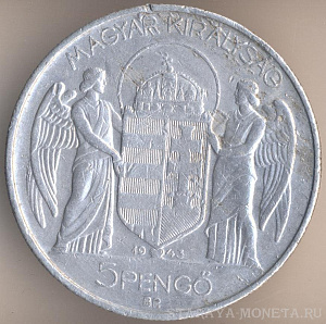 5 пенгё 1943 года, алюминий, масса - 6,1 грамма, диаметр - 36 мм, толщина - 3,9 мм, тираж - 2000000 экземпляров. Гравёр: Лайош Беран. Будапештский МД. Единственный выпуск; отчеканен в честь Семидесятипятилетия адмирала Миклоша Хорти. В обращении до 31 октября 1945 года.