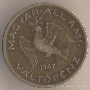 20 филлеров 1947 года, алюминиево-бронзовый сплав, масса - 4 грамма, диаметр - 21 мм, толщина - 1,9 мм, тираж - 18260000 экземпляров. Гравёр: Йожеф Ремени. Будапештский МД. Чеканились в 1946-48 и 1950 годах. Надпись на аверсе: "венгерская государственная разменная монета".
