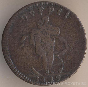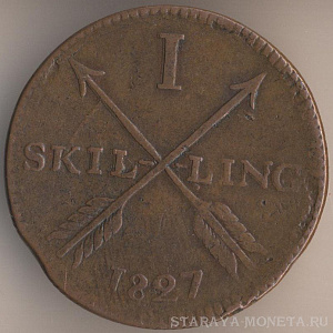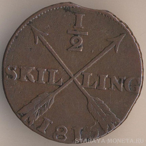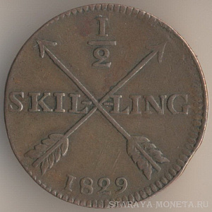 1/2 скиллинга 1829 года, медь, масса - 14,2 мм, диаметр - 31 мм, толщина - 1,5 мм, тираж - 2560000 экземпляров. Чеканились в 1819-22, 1824-25 и 1827-30 годах.