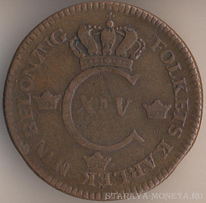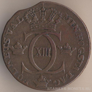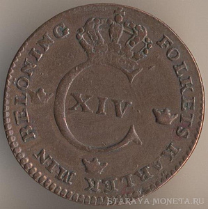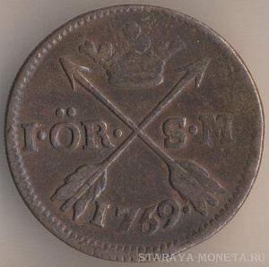 Король Адольф Фредрик (1751-1771). 1 эре сильверминт 1759 года, медь, масса - 14,2 грамма, диаметр - 30 мм, толщина - 2,45 мм, тираж - 352000 экземпляров. Чеканились в 1751, 1758-61, 1763 и 1768 годах. Литеры S.M. (silvermint) означают, что покупательная способность этой монеты соответствовала серебряному эре. Во всяком случае, формально.