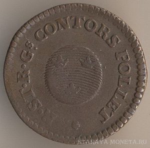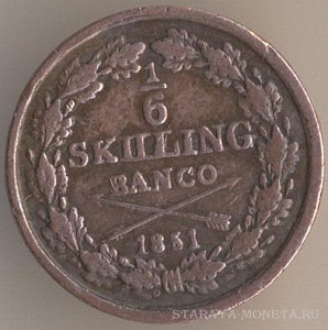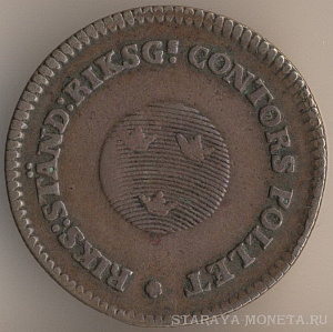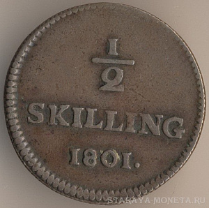 1/2 скиллинг риксгёльдс 1801 года, масса - 5,7 грамма, диаметр - 27,5 мм, тираж - 3203400 экземпляров. Чеканились в 1799-1802 годах. Также является токеном.