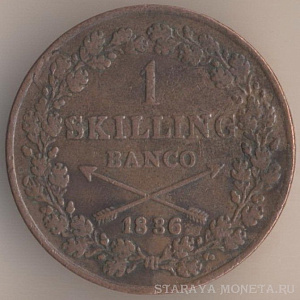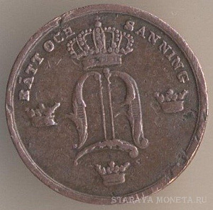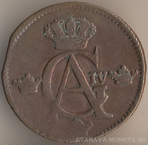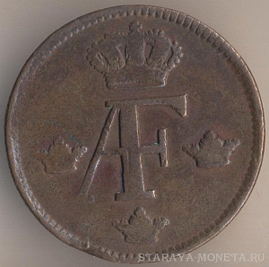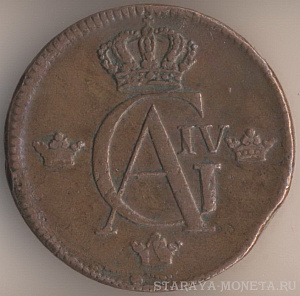 1 скиллинг 1805 года, медь, масса - 28,3 грамма, диаметр - 34 мм, тираж - экземпляров. Монетный двор Авесты.Чеканились в 1802, 1803 и 1805 годах. Эти монеты чеканились на монетах королей Фредрика I и Адольфа Фредрика достоинством 2 эре. Если внимательно приглядеться к представленному мною экземпляру, то под правой стрелкой над буквой I видны остатки литеры О; кроме того, на цифру "1" в дате "1805" указывает остаток стрелки, сохранившейся от первоначальной монеты.