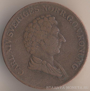 1/2 скиллинга 1809 года, медь, масса - 14,2 грамма, диаметр - 30,5 мм, толщина - 2,45 мм, тираж - 4844640 экземпляров. Монетный двор Авесты.Чеканились в 1802-1805, 1807 и 1809 годах.