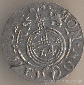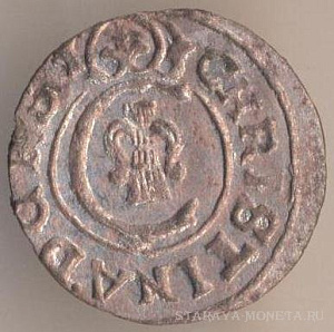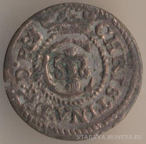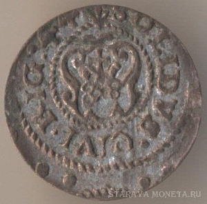 1/24 талера 1629 года, серебро. Выпуск короля Густава II Адольфа для обращения в городе Эльбинг (ныне - территория Польши). В данном случае имеет место непрочекан легенды, из чего следует, что монету изготовили изношенной матрицей.