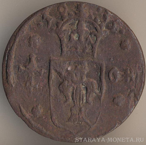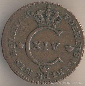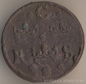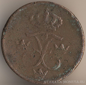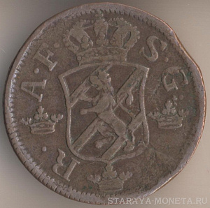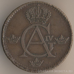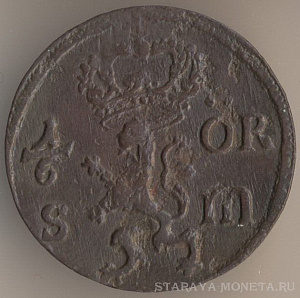 Король Густав IV Адольф (1792-1809). 1/4 скиллинг риксгёльдс 1800 года, медь, масса - 2,8 грамма, диаметр - 23,5 мм, толщина - 0,9 мм, тираж - 4932000 экземпляров. Чеканились в 1799-1800 годах. Относится к числу токенов.