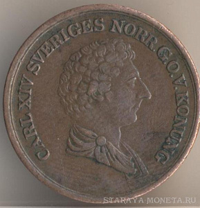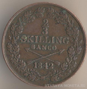Король Карл XIV Юхан. 2/3 банковских скиллинга 1843 года, медь, масса - 7,3 грамма, диаметр - 24,8 мм, диаметр - 2 мм, тираж - 526000 экземпляров. Чеканились в 1835-37, 1839-40 и 1842-43 годах.