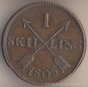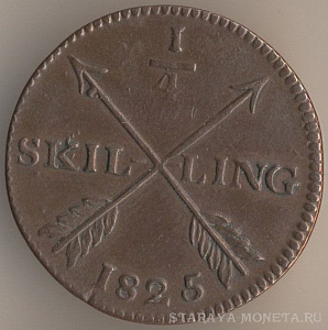 1/4 скиллинга 1802 года, медь, масса - 7,1 грамма, диаметр - 26 мм, толщина - 1,2 мм, тираж - 3383040 экземпляров. Чеканились в 1802, 1803 и 1805-1808 годах.