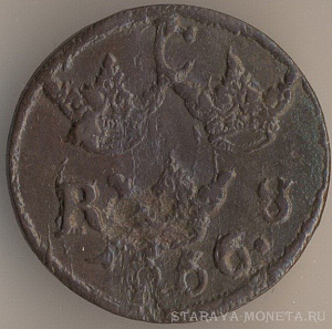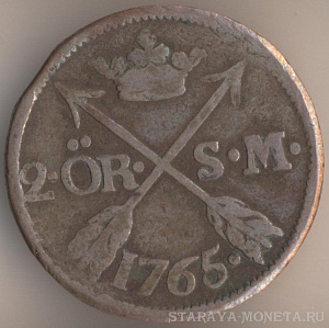 Король Адольф Фредрик (1751-1771). 2 эре сильверминт 1765 года, медь, масса - 28,3 грамма, диаметр - 33,7 мм, толщина - 3,9 мм, тираж - 5304000 экземпляров. Чеканились в 1751, 1755 и 1757-68 годах.