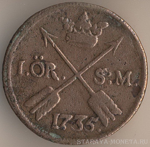 Король Фредрик I (1720-1751). 1 эре 1735 года, медь, масса - 14,2 грамма, диаметр - 30 мм, толщина - 2.3 мм, тираж - 1824000 экземпляров. Чеканились в 1730-50 годах.