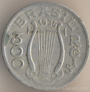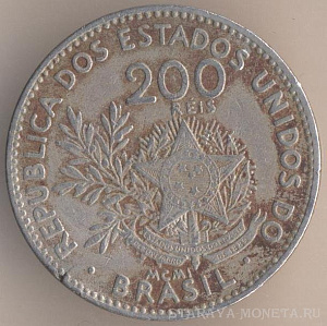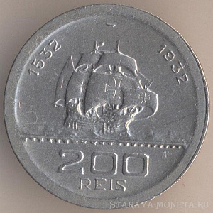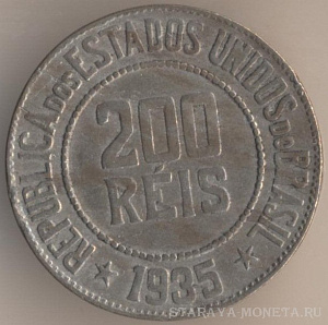 200 реалов 1935 года, медно-никелевый сплав, масса - 7,79 грамма, диаметр - 25 мм, толщина - 2 мм, тираж - 1329000 экземпляров. Чеканились в 1918-35 годах.