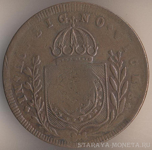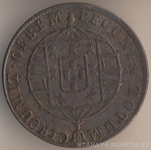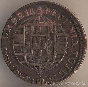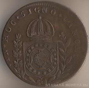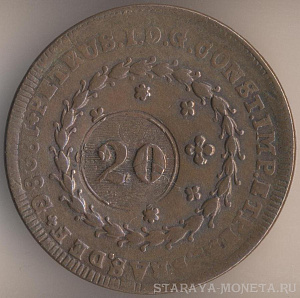 ХХ реалов 1819 года, медь, диаметр - 30 мм, тираж - 1440000 экземпляров. Монетный двор Рио-де-Жанейро. Правление короля Жоао VI. Чеканились в 1818-22 годах.
