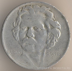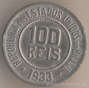 100 реалов 1933 года, медно-никелевый сплав, масса - 4,94 грамма, диаметр - 21,3 мм, толщина - 1,8 мм, тираж - 1314000 экземпляров. Чеканились в 1918-35 годах.