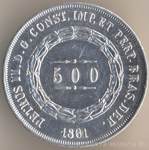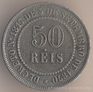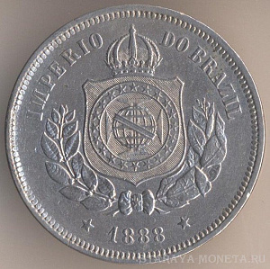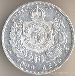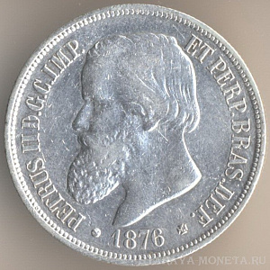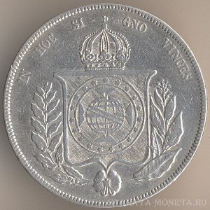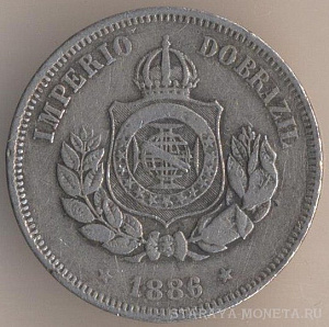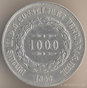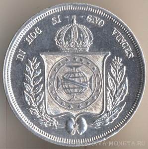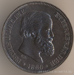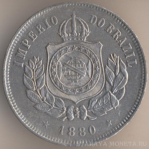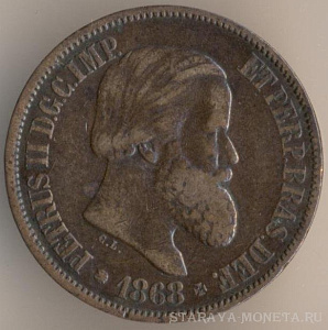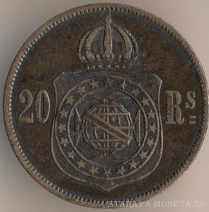 20 реалов 1868 года, бронза, масса - 7,1 грамма, диаметр - 25 мм, толщина - 1,74 мм, тираж - 90360000 экземпляров. Правление императора Педру II (1831-1889). Чеканились в 1868-70 годах. Выведены из обращения в 1889 году.
