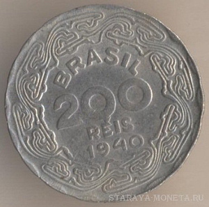200 реалов 1940 года, медно-никелевый сплав, масса - 3,44 грамма, диаметр - 18,82 мм, толщина - 1,6 мм, тираж - 10161000 экземпляров. Гравёры: Леопольдо Альвеш Кампуш (аверс) и Базилио Нуньеш (реверс). Чеканились в 1938, 1940 и 1942 годах. Реверс: президент Жетулиу Варгас (1930-1945 и 1951-1954). В августе 1954 года во время тяжёлого политического кризиса совершил самоубийство.