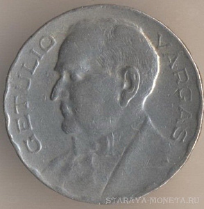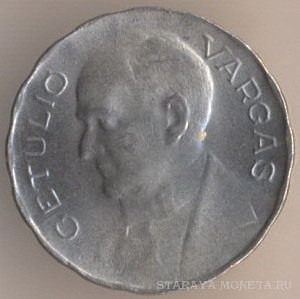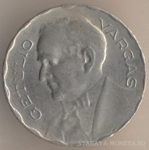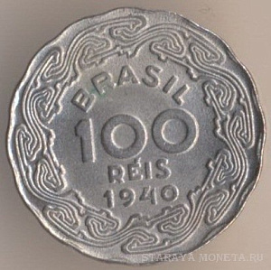 100 реалов 1940 года, медно-никелевый сплав, масса - 2,5 грамма, диаметр - 16,87 мм, тираж - 8797000 экземпляров. Гравёры: Леопольдо Альвеш Кампуш (аверс) и Орландо Моутиньо Майя. Чеканились в 1938, 1940 и 1942 годах. На монете изображён президент Жетулиу Варгас (1930-1945 и 1951-1954).