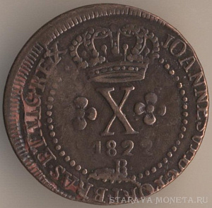 Соединённое королевство Португалии, Бразилии и Алгарве. Х реалов 1822 года, медь, масса - 3,83 грамма, диаметр - 24,9 мм, толщина - 1,1 мм, тираж - 1839000 экземпляров. Монетный двор Бахии. Правление короля Жоао VI (1816-1822 для Бразилии и 1816-1826 для Португалии). Чеканились в 1818-23 годах.