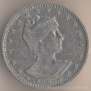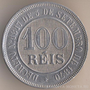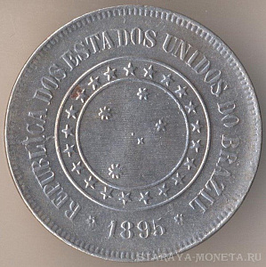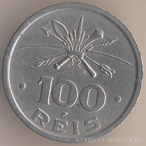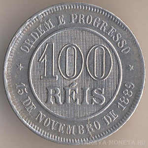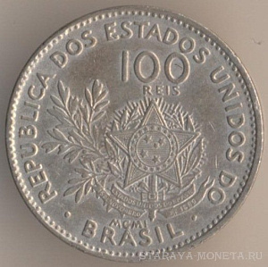 100 реалов 1895 года, медно-никелевый сплав, масса - 9,8 грамма, диаметр - 27 мм, толщина - 2,1 мм, тираж - 2308000 экземпляров. Гравёр: Франсиско Хосе Пинто Карнейро. Чеканились в 1889 и 1893-1900 годах. На реверсе выбит девиз: ORDEM E PROGRESSO, что означает "Порядок и Прогресс".
