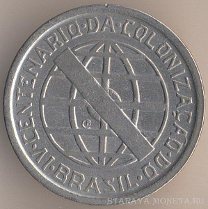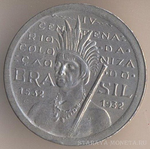 100 реалов 1932 года, медно-никелевый сплав, масса - 5 граммов, диаметр - 20 мм, толщина - 1,8 мм, тираж - 1012000 экземпляров. Гравёры: Леопольдо Кампуш (аверс) и Вальтер Толедо (реверс). Монета отчеканена к четырёхсотлетию колонизации Бразилии. На реверсе изображён Тибирика - индейский вождь, принявший христианство и оказавший португальским колонизаторам большую помощь в деле покорения Бразилии. В дальнейшем потомки Тибирики сочетались браком с представителями португальского дворянства. Королева Швеции Сильвия (супруга правящего ныне короля Карла XVI Густава) является прямым потомком Тибирики в 14 поколении.