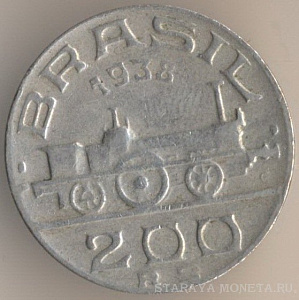 200 реалов 1938 года, медно-никелевый сплав, масса - 6 граммов, диаметр - 23 мм, толщина - 1,98 мм, тираж - 5787000 экземпляров. Гравёр: Калмон Баррето. Чеканились в 1936-38 годах. На реверсе изображён Иринеу Евангелиста де Суза, барон и виконт де Мауа (1813-1889) - бразильский менеджер, промышленник и политический деятель. Он построил первую в стране железную дорогу.