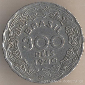 300 реалов 1940 года, медно-никелевый сплав, масса - 4,54 грамма, диаметр - 20,83 мм, толщина - 1,7 мм, тираж - 2020000 экземпляров. Гравёры: Леопольдо Альвеш Кампуш (реверс) и Бенедито де Аруйо Рибейро (аверс). Чеканились в 1938, 1940 и 1942 годах.