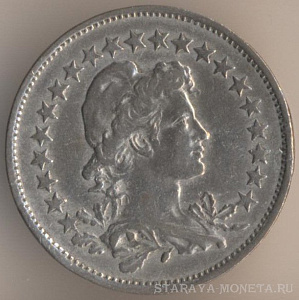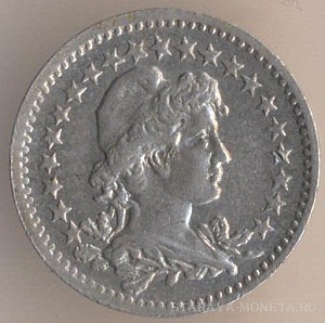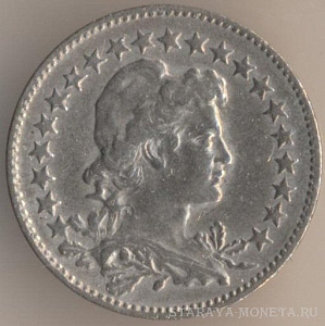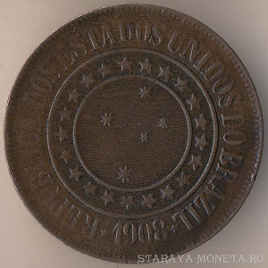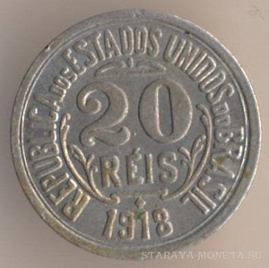 Соединённые Штаты Бразилии. 20 реалов 1918 года, медно-никелевый сплав, масса - 2 грамма, диаметр - 15,5 мм, тираж - 373000 экземпляров. Чеканились в 1918-21, 1927 и 1935 году.