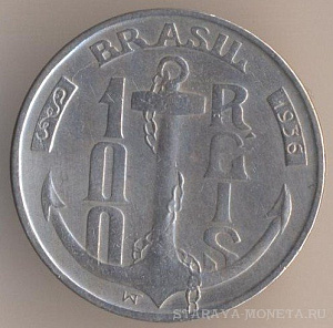 100 реалов 1936 года, медно-никелевый сплав, масса - 4,62 грамма, диаметр - 19 мм, толщина - 1,75 мм, тираж - 3928000 экземпляров. Чеканились в 1936-38 годах. На реверсе изображён маркиз де Тамандаре (1807-1897) - участник Войны Бразилии за независимость, первый бразильский адмирал, рождённый на территории Бразилии. Принял участие во множестве войн. Считается покровителем бразильского флота.