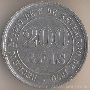 200 реалов 1901 года, медно-никелевый сплав, масса - 8 граммов, диаметр - 25 мм, толщина - 2 мм, тираж - 12625000 экземпляров. Гравёр: Эрнест Полин Тассе. Единственный выпуск. Особенностью монеты является указание даты латинскими цифрами: MCMI.