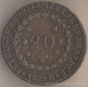 Бразильская Империя. 20 реалов 1825 года, медь, масса - 7,17 грамма, диаметр - 30 мм, толщина - 0,6 мм, тираж - 9054000 экземпляров. Монетный двор Рио-де-Жанейро.Правление императора Педру I (1822-1831). Чеканились в 1823-30 годах. На аверсе отчеканен девиз: IN HOC SIGNO VINCES, то есть, "Сим победиши!", являвшийся девизом португальских монархов.