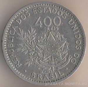 400 реалов 1930 года, медно-никелевый сплав, масса - 11,7 грамма, диаметр - 30 мм, толщина - 2,1 мм, тираж - 1031000 экземпляров. чеканились в 1918-23, 1925-27, 1929-32 и 1935 годах.