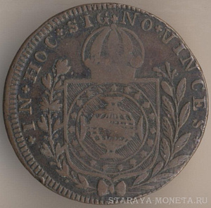 40 реалов 1827 года, медь, масса - 14,34 грамма, диаметр - 37 мм. Монетный двор Рио-де-Жанейро. Правление императора Педру I (1822-1831). Чеканились в 1823-31 годах. Без надчекана и ошибки в написании девиза.