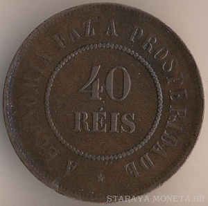 40 реалов 1908 года, бронза, масса - 13 граммов, диаметр - 30 мм, толщина - 2,15 мм, тираж - 4639000 экземпляров. Чеканились в 1889, 1893-98, 1900-1901 и 1907-12.