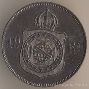 Бразильская Империя. 10 реалов 1869 года, бронза, масса - 3,6 грамма, диаметр - 20 мм, толщина - 1,36 мм. Правление императора Педру II (1831-1889). Чеканились в 1868-70 годах. Выведены из обращения в 1889 году.